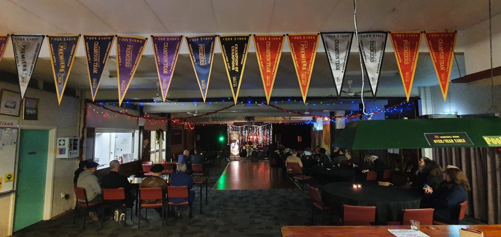 And the stage: the largest of the aforementioned honour boards obscured with a massive black drape, and some leftover tinsel and other decorations from the previous night’s Christmas In July adding a 70s disco night feel to a rather more bluesy, roots, and acoustic serving of music.